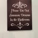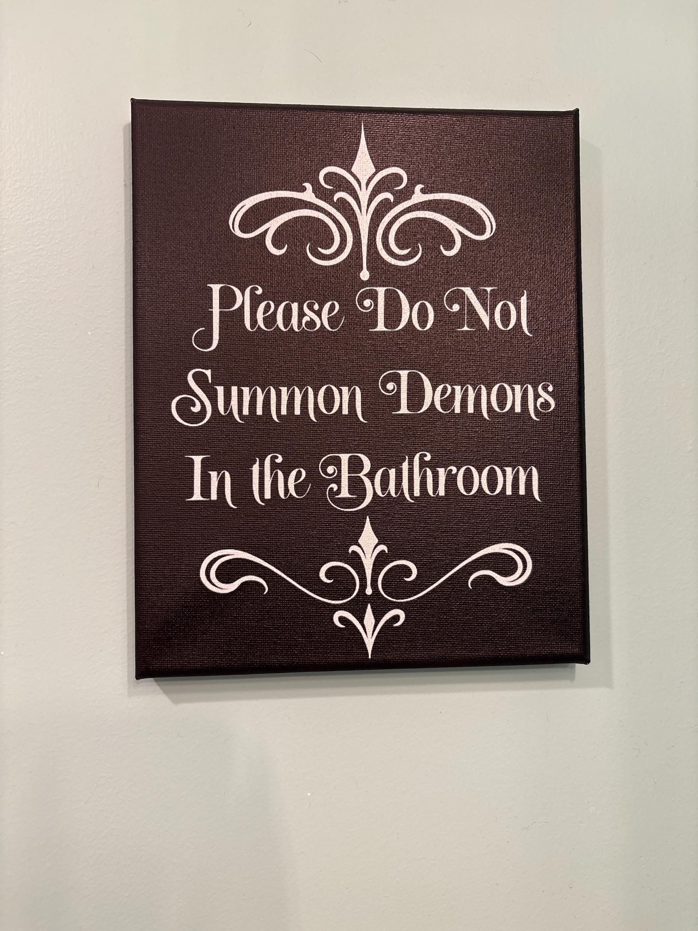 Please Do Not Summon Demons in the Bathroom gothic artwork. The design is printed in white on a black 8x10 stapled back canvas.